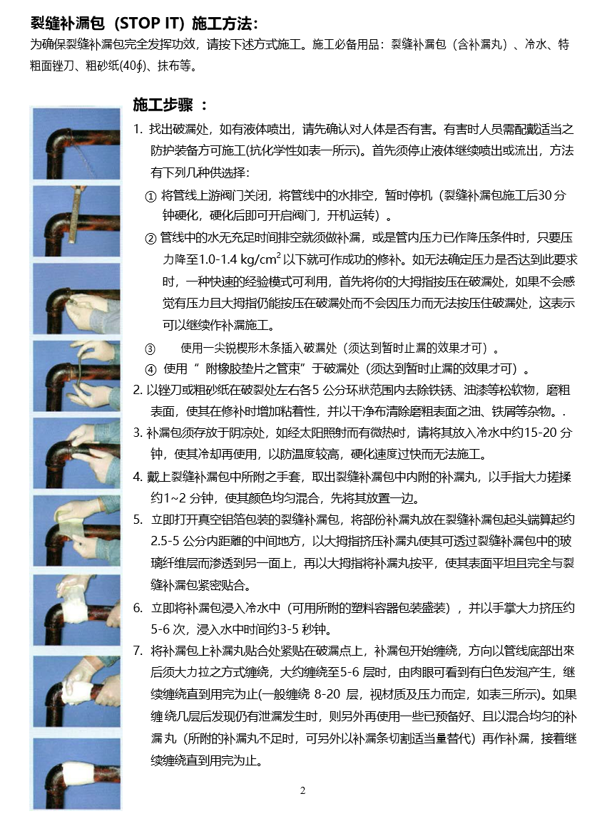 裂縫補(bǔ)漏包(STOP IT)是由玻璃強(qiáng)化纖維與聚氨樹脂的混合物所組成,其以水作為硬化劑,硬化時(shí)間僅 需 30 分鐘即可,使用極為方便,抗化學(xué)性佳、可不停線作修補(bǔ)、經(jīng)濟(jì)實(shí)用,是緊急搶修泄漏的最佳修 補(bǔ)利器。